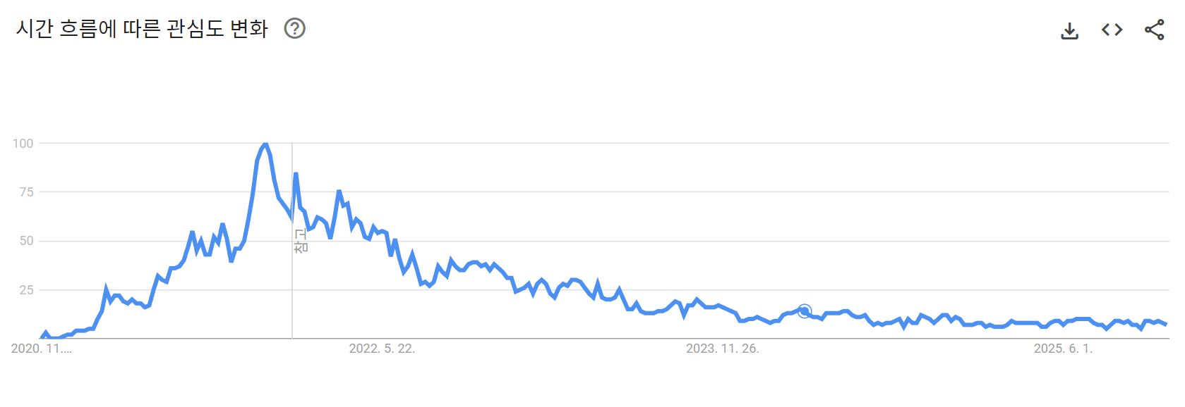 실제 구글 트렌드 기준, '메타버스' 검색량은 2021년 11월 최고치를 찍은 뒤 1년 만에 71% 감소했습니다. 이제는 대중의 관심에서 멀어진 키워드가 됐죠. 물론 메타버스의 활용 사례 자체는 여전히 존재합니다. 산업·교육·게임 분야에서는 꾸준히 실험이 이어지고 있죠. 다만 대중화의 파급력을 다시 얻을 수 있을지는 여전히 미지수입니다.